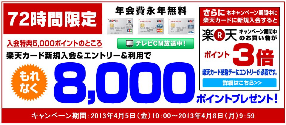 前回こちらの記事で楽天カード入会の8000ポイントキャンペーンを紹介しましたが、また72時間限定でやってますね!