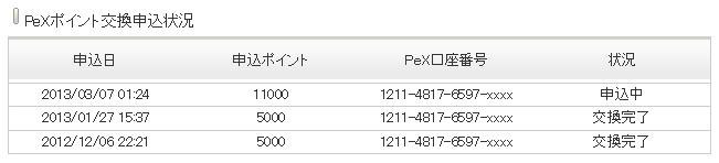 ここ数カ月はかなりいいペースでポイントが入ってきています。大口の無料会員登録案件がいくつかあったのでそれで稼いでいます。ポイント交換も11月、12月、今回といい感じでできています。ポイントタウンはポイントの換金履歴がないみたいなので、交換先のPeX側の履歴を載せますです。