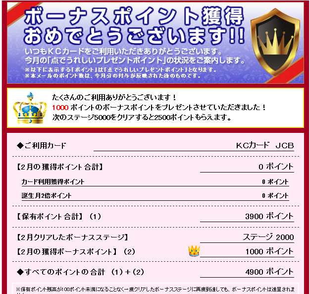 どうやらKCカードにはポイントが一定数に達するとボーナスポイントがもらえる仕組みがあるようです。その中に、2000ポイントで1000ポイントプラス、というのがあったようです。