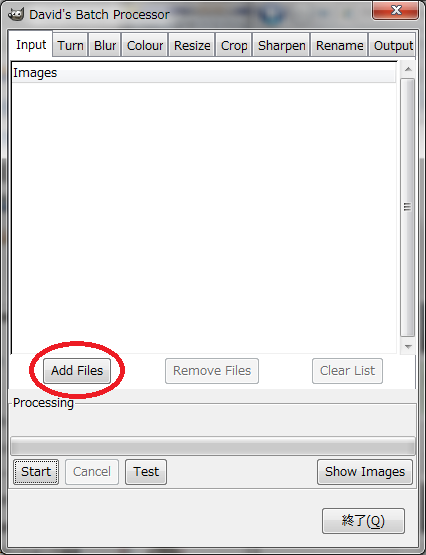 すると、"David's Batch Processor"というダイアログが開きますので、Add Filesというボタンをクリックします。