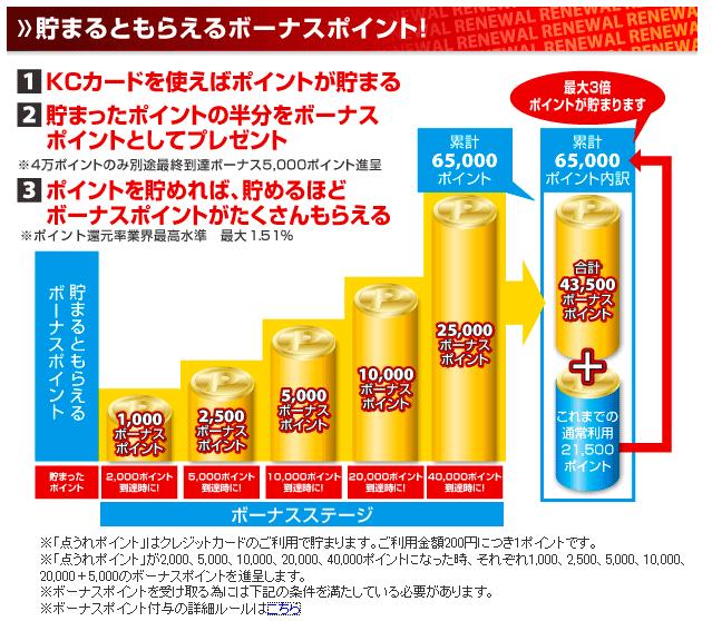 KCカードには「点でうれしいポイント」という仕組みがあり、ポイント獲得数が一定ポイントに達するとそこからさらにボーナスポイントが付くのです!