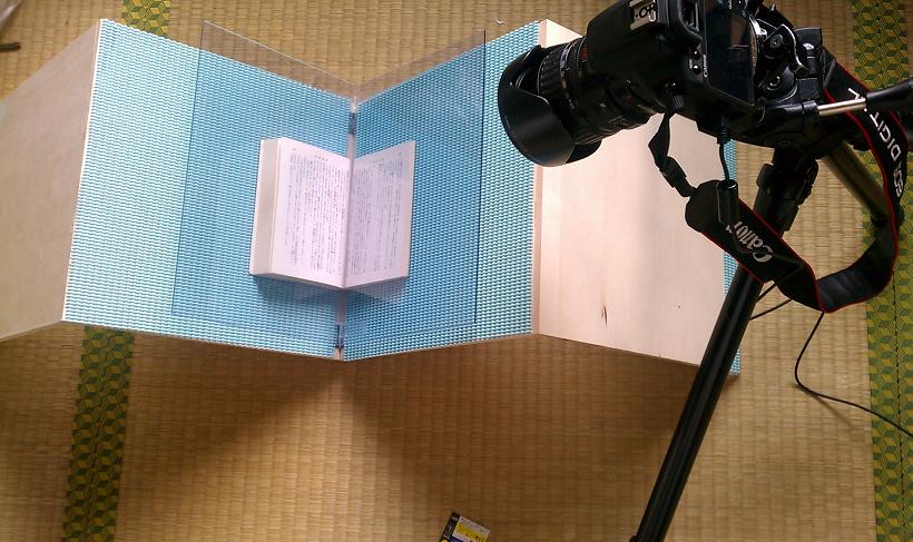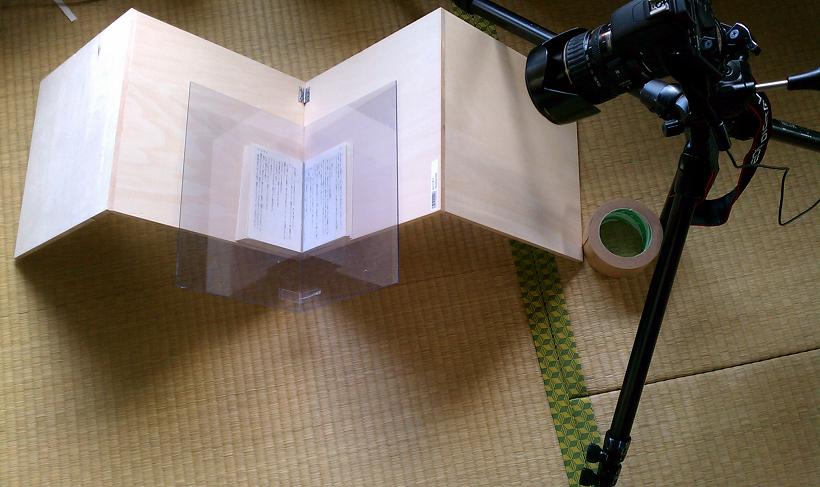この台の上に本を置き、透明な板で押さえながら斜め上からページに正対するようにカメラを配置して撮影します。